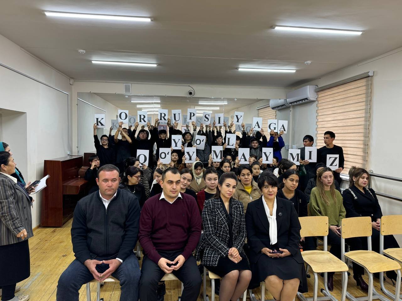 Bugun, 3-dekabr sanasida O‘zbekiston davlat xoreografiya akademiyasi Urganch filialida “9-dekabr – Xalqaro korrupsiyaga qarshi kurashish kuni”ga bag‘ishlangan “Aksilkorrupsiya oyligi” doirasida “Ochiq eshiklar kuni” tashkil etildi.