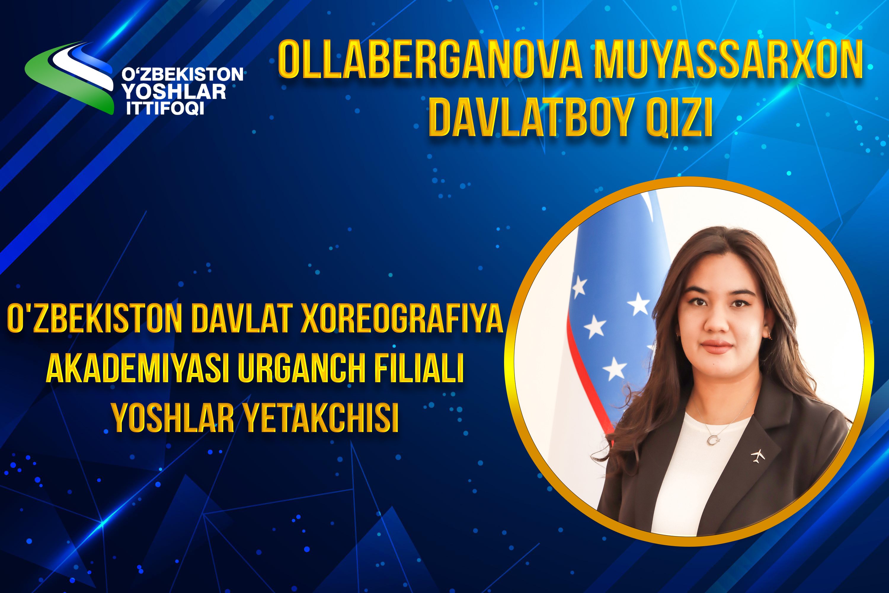 Ollaberganova Muyassarxon Davlatboy qizi -Oʻzbekiston davlat xoreografiya akademiyasi Urganch filiali Yoshlar yetakchisi