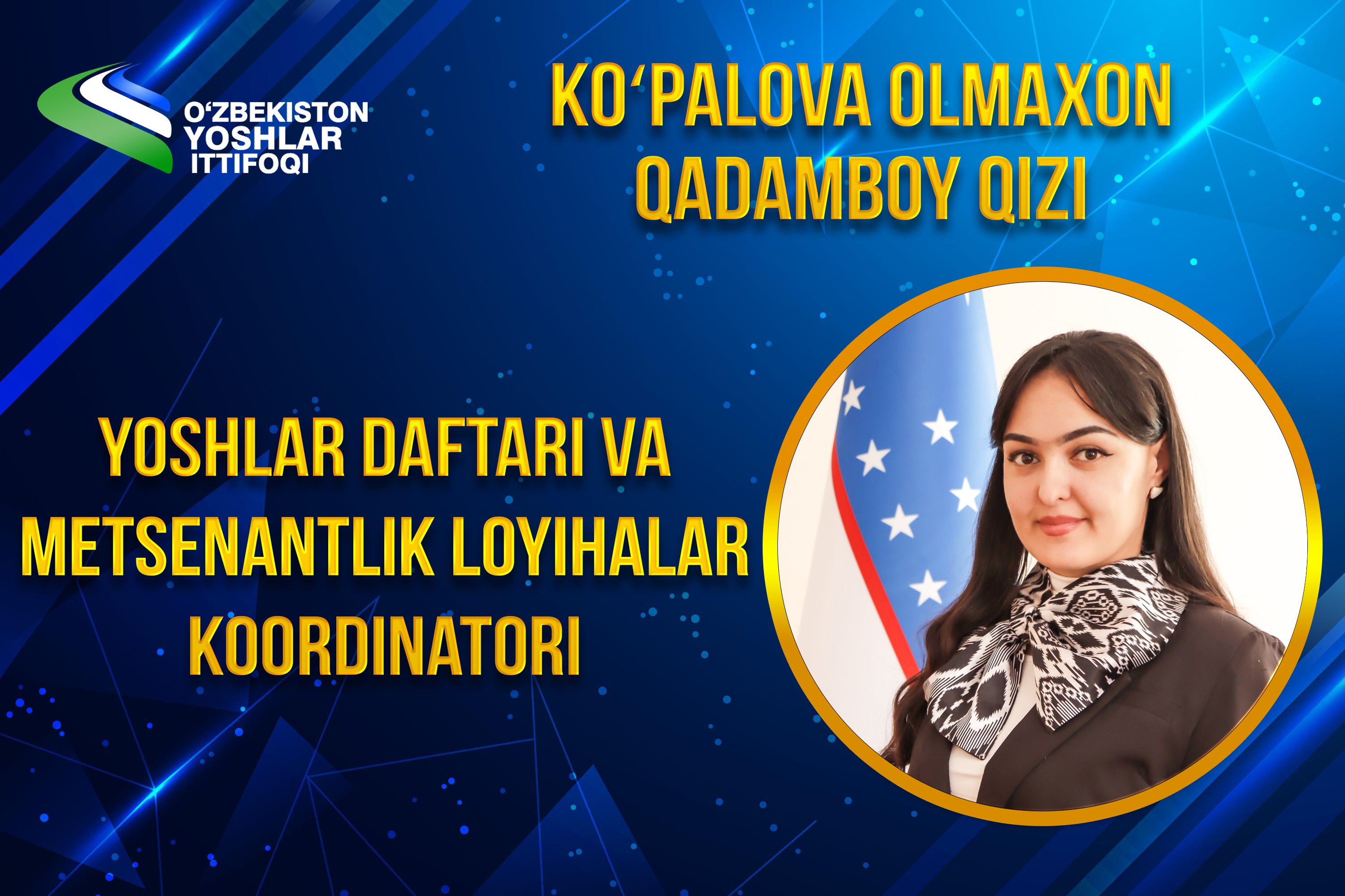 Ko‘palova Olmaxon Qadamboy qizi - Yoshlar daftari va metsenantlik loyihalar koordinatori