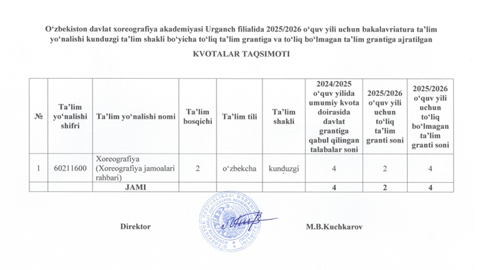 O‘zbekiston davlat xoreografiya akademiyasi Urganch filialida 2025/2026 o‘quv yili uchun bakalavriatura ta’lim yo‘nalishi kunduzgi ta’lim shakli bo‘yicha to‘liq ta’lim grantiga va to‘liq bo‘lmagan ta’lim grantiga ajratilgan KVOTALAR TAQSIMOTI