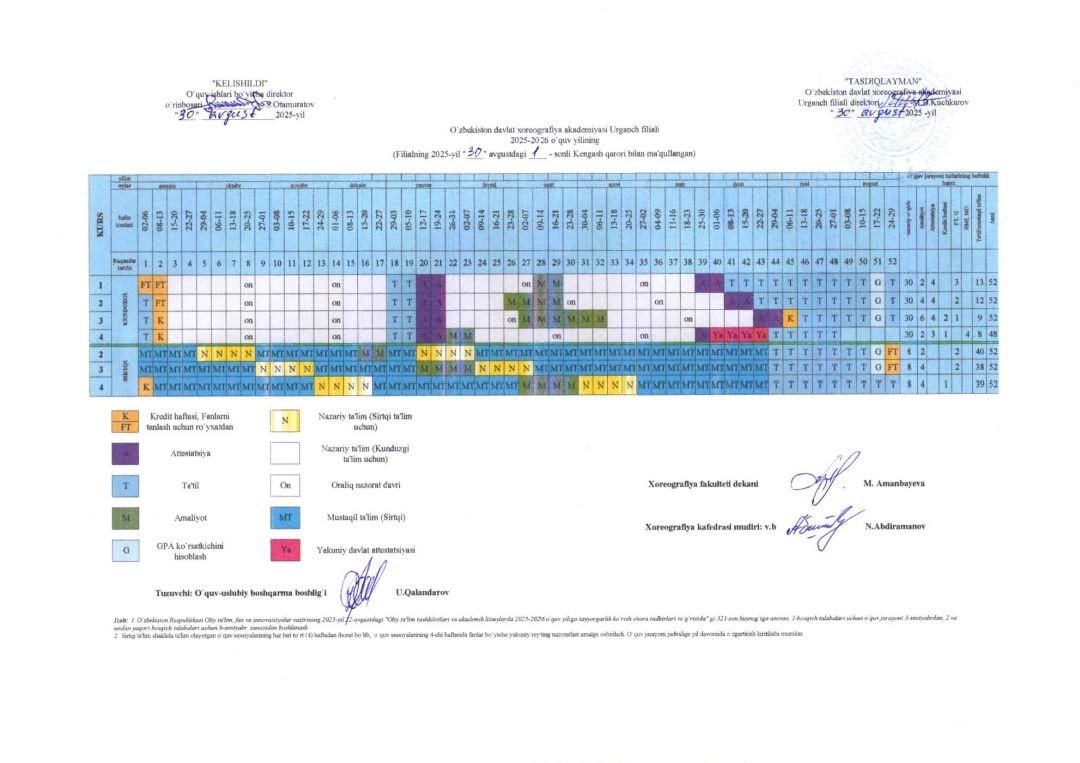 Oʻzbekiston davlat xoreografiya akademiyasi Urganch filiali 2025–2026-oʻquv yiliga moʻljallangan o‘quv jarayoni jadvali.