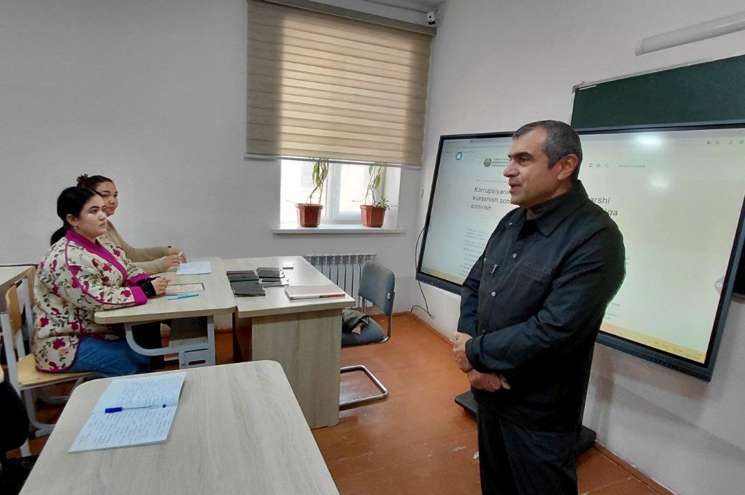 Tadbirda Korrupsiyaga qarshi kurashish “Komplayens nazorat” tizimini boshqarish bo‘limi bosh mutaxassisi M.Nurullayev hamda fakultet dekani M.Amanbayeva ishtirok etib, talabalarga korrupsiyaning salbiy oqibatlari, unda yoshlarning faolligi va tanlov shartlari haqida batafsil ma’lumot berishdi.