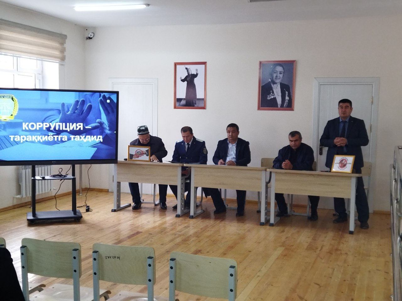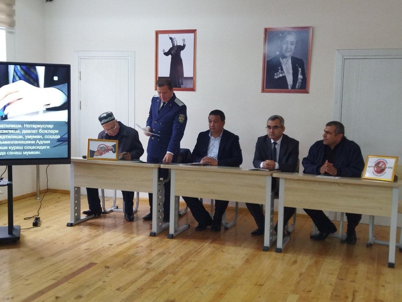 🔸Har bir xodimning korrupsiyaga qarshi kurashishda faolligini oshirish, huquqiy targ‘ibotni amalga oshirishga qaratilgan davra suhbati o‘tkazish ko‘zda tutilgan bo‘lib, bu maqsadda bir qator huquqni muhofaza qiluvchi tashkilotlar mas’ul xodimlari, jumladan,  Urganch shahar Adliya bo‘limi mas’ul xodimi S.Otabayev, Bosh prokuratura huzuridagi Iqtisodiy jinoyatlarga qarshi kurashish departamenti Xorazm viloyati boshqarmasi mas’ul xodimi T.Shamakov, Urganch tumanlararo Fuqarolik sudi raisi Sh.Ismoilovlar taklif qilinib, ularning ma’ruzalari tinglandi.