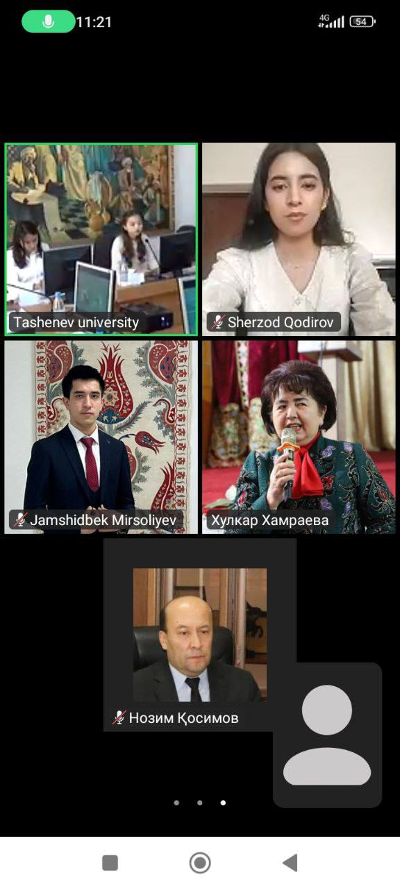 “San’atshunoslik ta’lim yo’nalishi talabalari: Jamshid Mirsoliyev “O‘zbek raqs san’atining milliy chizgilari”, Musharraf Tursunova “O‘zbek – Qozoq ilmiy–madaniy aloqalari”, Durdona Ubaydullayeva “Qozog’iston o‘zbeklari bolalar folklor raqslari” mavzularida rus va o‘zbek tillarida ma’ruzalari bilan masofadan ishtirok etdilar.