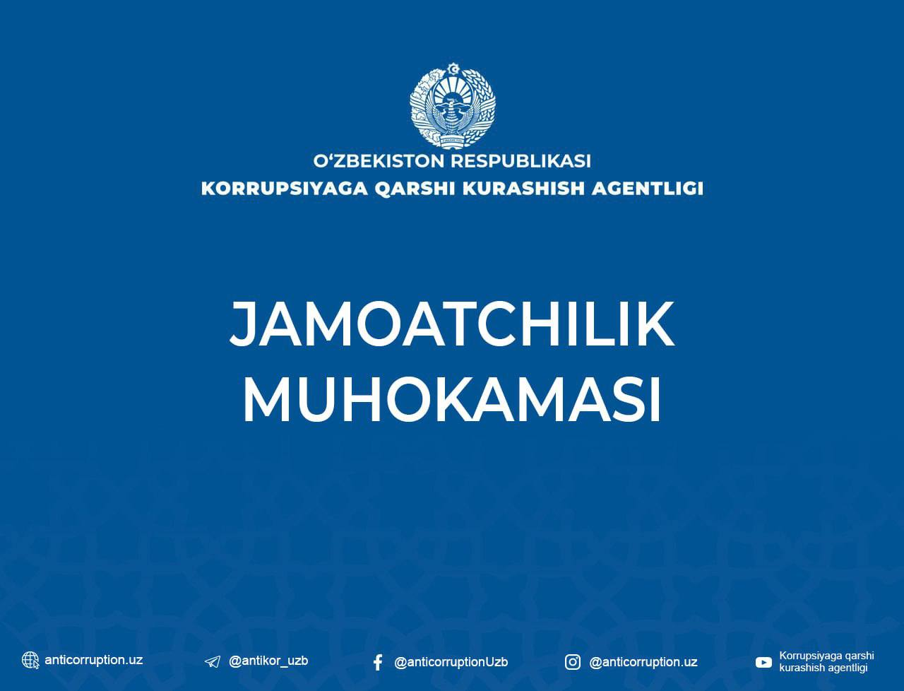 Agarda siz korrupsiyaga oid huquqbuzarlik holatlariga duch kelsangiz Korrupsiyaga qarshi kurashish agentligining “Call-markazi” – 1253 yoki eanticor.uz  elektron platformasi orqali murojaat qilishingizni so‘raymiz.