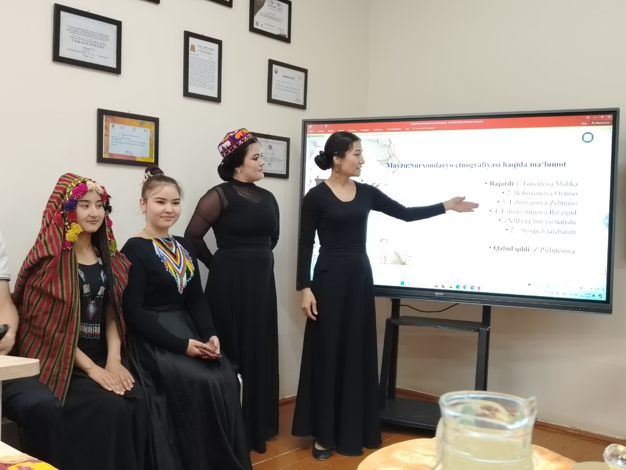 Mlliy urf-odat udumlarga asoslangan folklor raqslari hamda sahna liboslari to'g'risida ma'lumotlarni talabalar tomonidan tayyorlangan taqdimotlar namoyish qilindi.