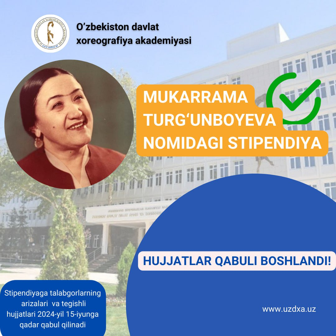 О‘zbekiston Respublikasi Oliy va о‘rta maxsus ta’lim vazirining 2022-yil 22-dekabr “Oliy ta’lim muassasalarida ilm-fan sohasida muvaffaqiyatga erishgan mashhur о‘zbek ayollari nomi bilan ataluvchi stipendiyani joriy etish tо‘g‘risida”gi 422-son buyrug‘i asosida О‘zbekiston davlat xoreografiya akademiyasining bakalavriat ta’lim yо‘nalishlari va magistratura mutaxassisligi bо‘yicha tahsil olayotgan talaba-qizlar uchun “Mukarrama Turg‘unboyeva nomidagi maxsus stipendiya”ga tanlov e’lon qiladi.