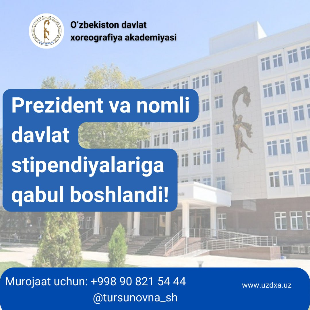 🟢O’zbekiston davlat xoreografiya akademiyasi 2024-2025 o‘quv yili uchun O‘zbekiston Respublikasi Prezidenti stipendiyasi va nomli (Islom Karimov) davlat stipendiyalariga qabul e’lon qiladi!