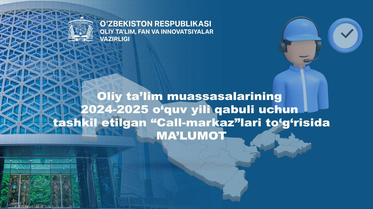2024/2025-o‘quv yili qabul jarayonlarida abituriyentlar va ularning ota-onalariga qulaylik yaratish hamda ularni qiziqtirgan savollariga tezkor javob berish maqsadida oliy ta’lim muassasalarida “Call-center” xizmati yo‘lga qo‘yilgan.