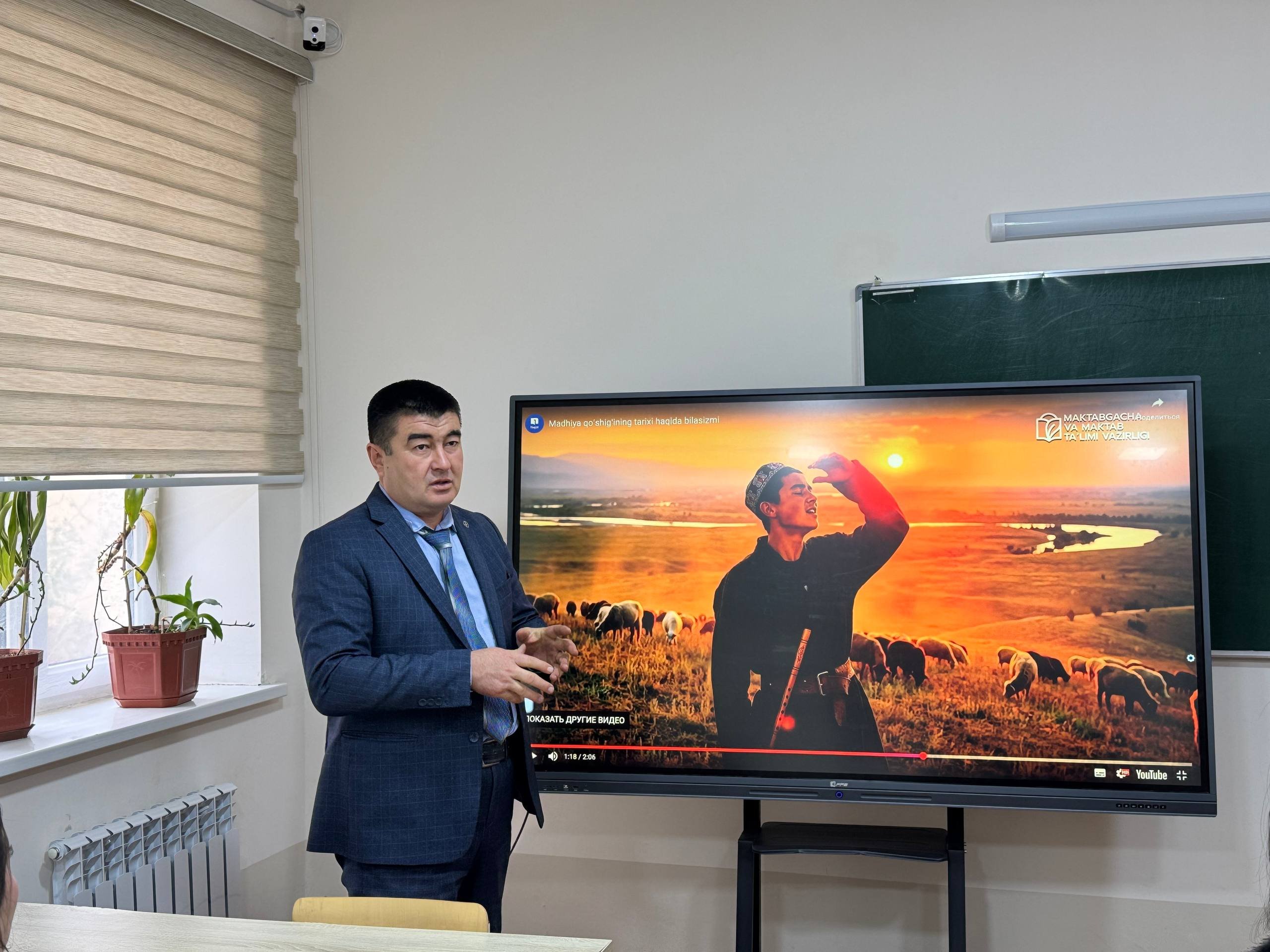 Bugun, 10-dekabr kuni O‘zbekiston davlat xoreografiya akademiyasi Urganch filialida “Kelajak soati” doirasidagi navbatdagi “Ma’rifat darslari” bo‘lib o‘tdi. Ushbu ma’rifiy dars O‘zbekiston Respublikasi Davlat madhiyasining 33 yilligiga bag‘ishlanib, “Millat qo‘shig‘i” mavzusida tashkil etildi.