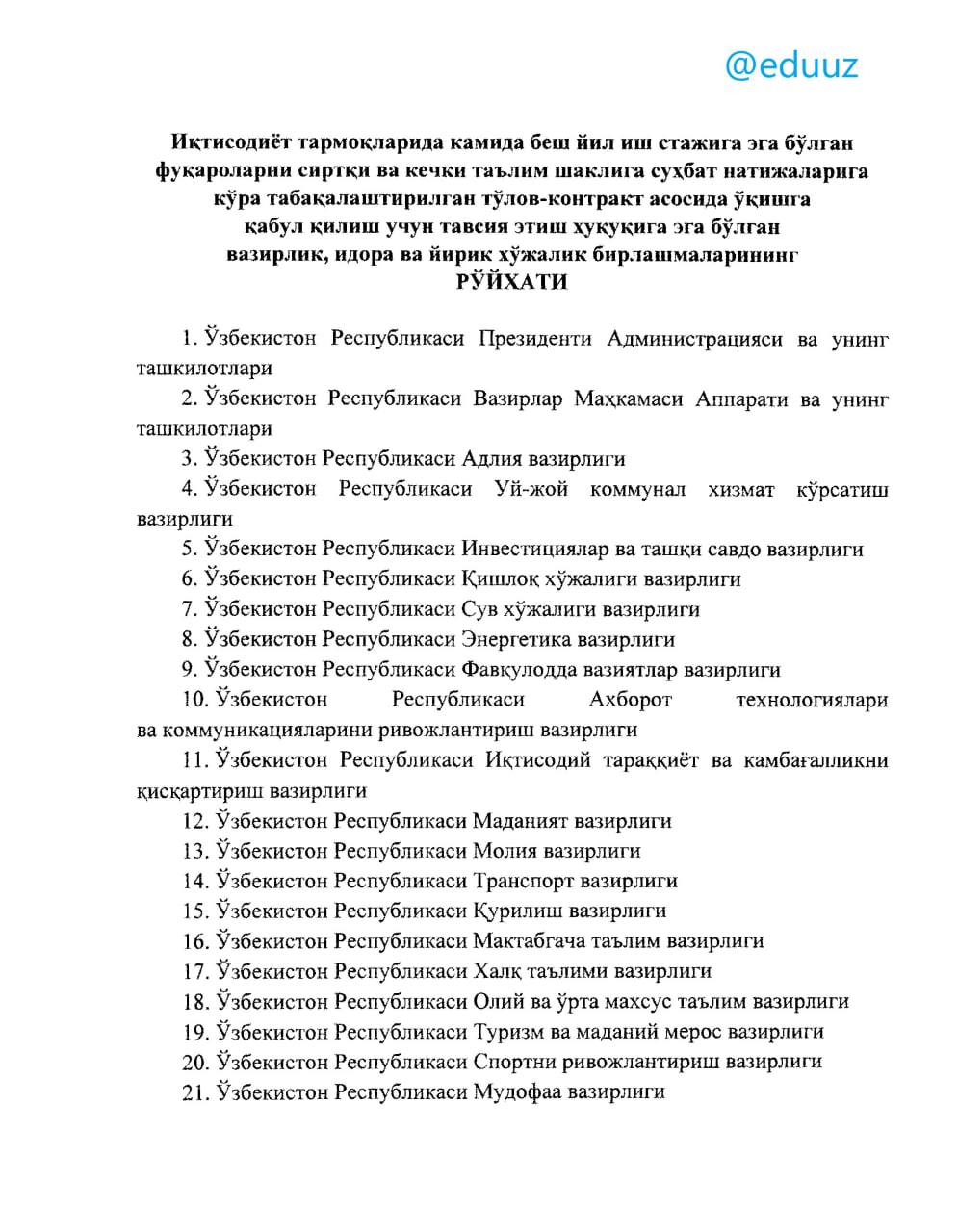 Davlat qabul komissiyasi qarori bilan Iqtisodiyot tarmoqlarida kamida besh yil ish stajiga ega bo‘lgan fuqarolarni sirtqi va kechki ta’lim shakliga suhbat natijalariga ko‘ra tabaqalashtirilgan to‘lov-kontrakt asosida o‘qishga qabul qilish uchun tavsiya etish huquqiga ega bo‘lgan vazirlik, idora va yirik birlashmalari ro‘yxati tasdiqlandi .