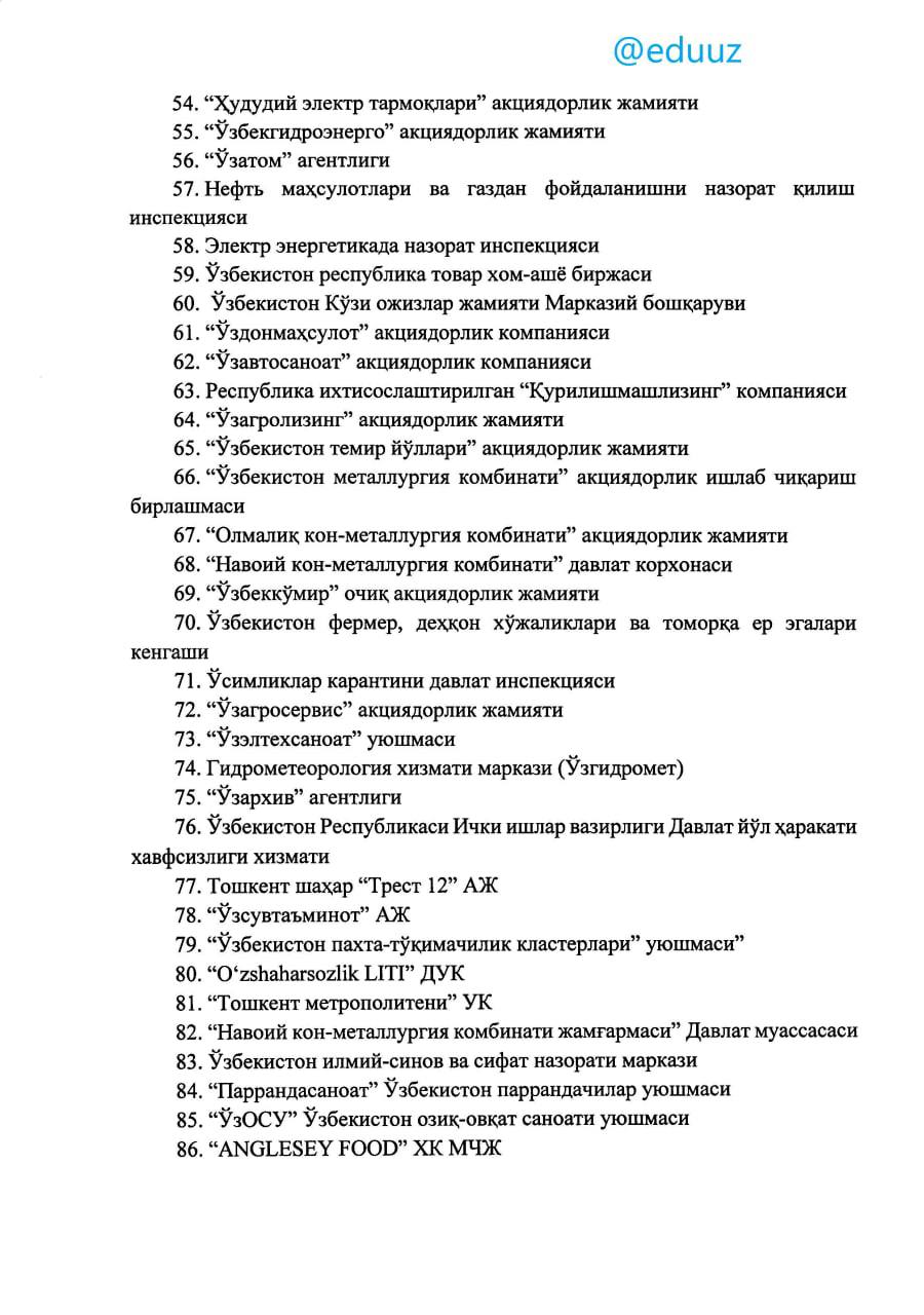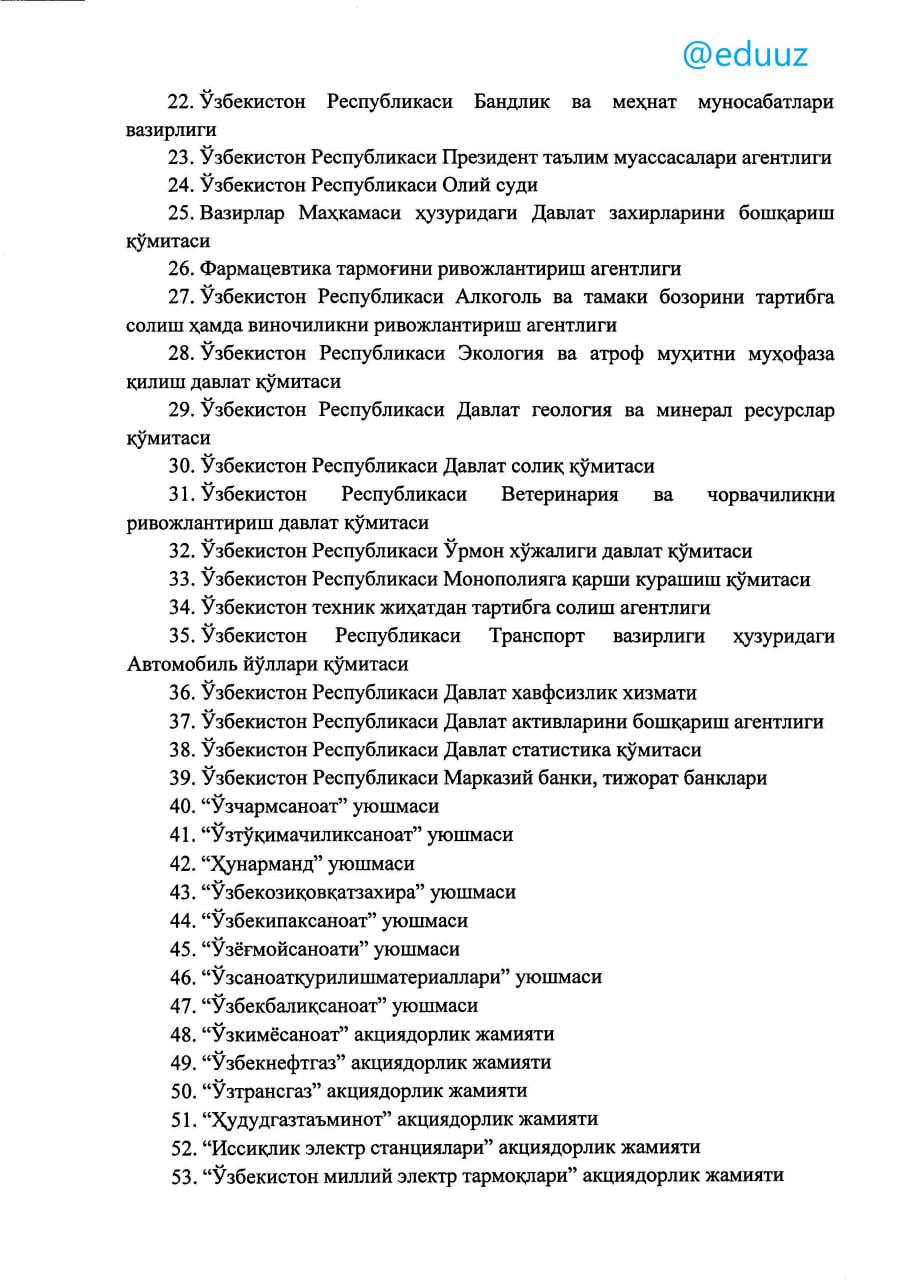 5 yil ish stajiga ega bo‘lgan xodimlarni OTMga suhbat asosida qabul qilish uchun tavsiyanoma beradigan tashkilotlar ro‘yxati tasdiqlandi