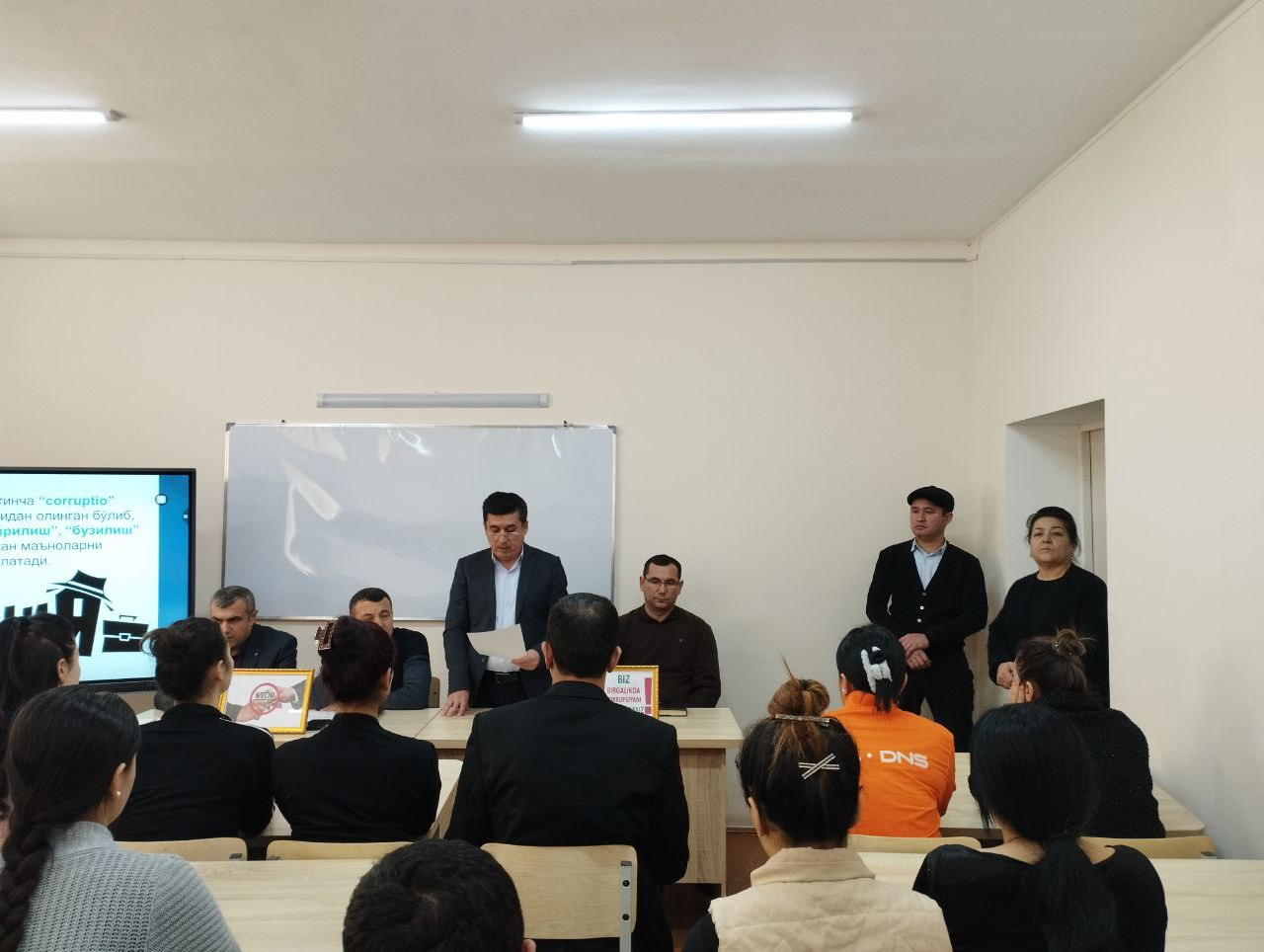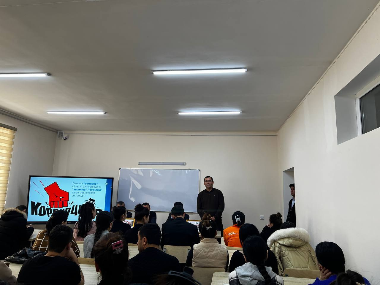 🔸Tadbir muhim mavzuga doir slaydlar va video roliklar namoyishi. Korrupsiyaning davlat, unga qarshi kurash olib boriladigan ishlar xususida gapirib berildi. Talaba'qish faoliyati jarayonida korrupsiyaviy yordamga aralashib qol mas'ullari muammosi to'xtalib o'tildi va ogohlikka chaqirildi.